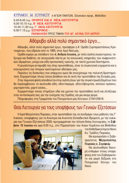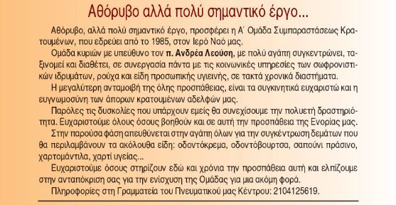 Αθόρυβο, αλλά πολύ σημαντικό έργο, προσφέρει η Α’ Ομάδα Συμπαραστάσεως Κρατουμένων που εδρεύει στην Ευαγγελίστρια Πειραιώς από το 1985. Ομάδα με υπεύθυνο τον π. Ανδρέα Λεούση, προσφέρει είδη προσωπικής υγιεινής και ρούχα σε τακτά χρονικά διαστήματα. Η μεγαλύτερη ανταμοιβή της όλης προσπάθειας είναι τα συγκινητικά ευχαριστώ των απόρων κρατουμένων αδελφών μας.