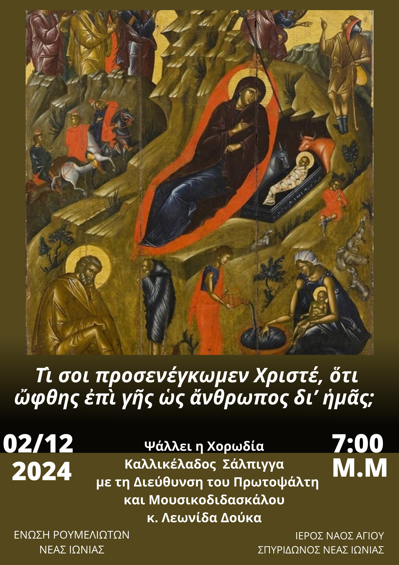 Ο Ιερός Ναός του Αγίου Σπυρίδωνος Νέας Ιωνίας και η Ένωση Ρουμελιωτών Νέας Ιωνίας διοργανώνουν Συναυλία Βυζαντινής Μουσικής εν όψει της του Χριστού Γεννήσεως την Δευτέρα 2 Δεκεμβρίου 2024 και ώρα 7:00 μ.μ., η οποία θα πραγματοποιθεί εντός του Ιερού Ναού.