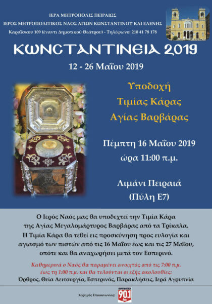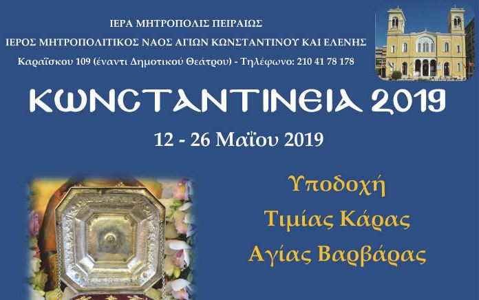 Στον Μητροπολιτικό Ιερό Ναό Αγίων Κωνσταντίνου και Ελένης Πειραιώς τίθεται σε προσκύνηση η Τιμία Κάρα της Αγίας Μεγαλομάρτυρος Βαρβάρας η οποία θα παραμείνει στο Ναό έως τις 27/05 . Στο Ναό πραγματοποιούνται λατρευτικές και πολιτιστικές εκδηλώσεις με την επωνυμία «Κωνσταντίνεια 2019» με την ευκαιρία της μνήμης των Αγίων Ισαποστόλων Κωνσταντίνου και Ελένης. Καθημερινά τελούνται Ιερές Ακολουθίες (Θεία Λειτουργία, Εσπερινός, Παρακλήσεις, Χαιρετισμοί, ιερές αγρυπνίες).