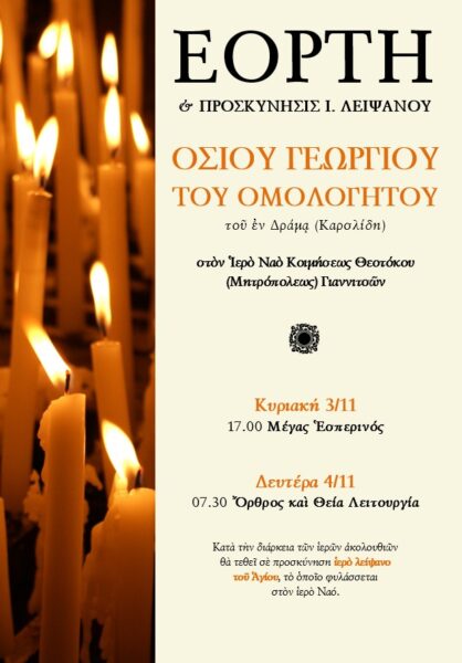 02/11/2019 02/11/2019 Την Δευτέρα 4 Νοεμβρίου 2019, μνήμη του οσίου και θεοφόρου πατρός ημών Γεωργίου του Ομολογητού, του εν Δράμα (Καρσλίδη), εορτάζει ο Ιερός Ναός Κοιμήσεως της Θεοτόκου Γιαννιτσών (Μητρόπολη). Κατά την διάρκεια του εορτασμού, θα τεθεί σε προσκύνηση τμήμα του ιερού λειψάνου του Αγίου, το οποίο φυλάσσεται μόνιμα στον Ιερό Ναό. ΚΥΡΙΑΚΗ 3/11 17.00 Μέγας Εσπερινός...