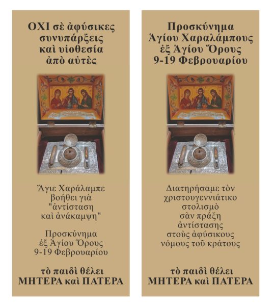 Με επίκαιρα συνθήματα στην είσοδο του ναού, για τα όσα εργάζεται η κρατική εξουσία κατά των ανθρώπων, μέχρι τις 19 Φεβρουαρίου το μεσημέρι, ο άγιος Χαραλάμπης θα ευλογεί τους πιστούς που θα προσέρχονται στο ναό από τις 7:30 έως και τις 21:30.