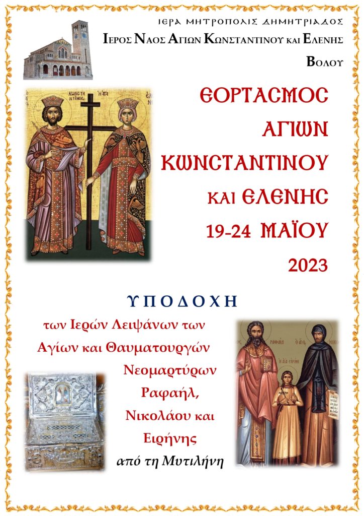 Τα Ιερά Λείψανα των Αγίων και Θαυματουργών Νεομαρτύρων Ραφαήλ, Νικολάου και Ειρήνης από τη Μυτιλήνη, τα οποία ευλαβείται ο χριστεπώνυμος λαός της πατρίδας, θα έχει την ευλογία να φιλοξενήσει ο Ιερός Ναός των Αγίων Κωνσταντίνου και Ελένης Βόλου, στα πλαίσια του Ετήσιου Εορτασμού των Αγίων, από τις 19 έως και τίς 24 Μαΐου.