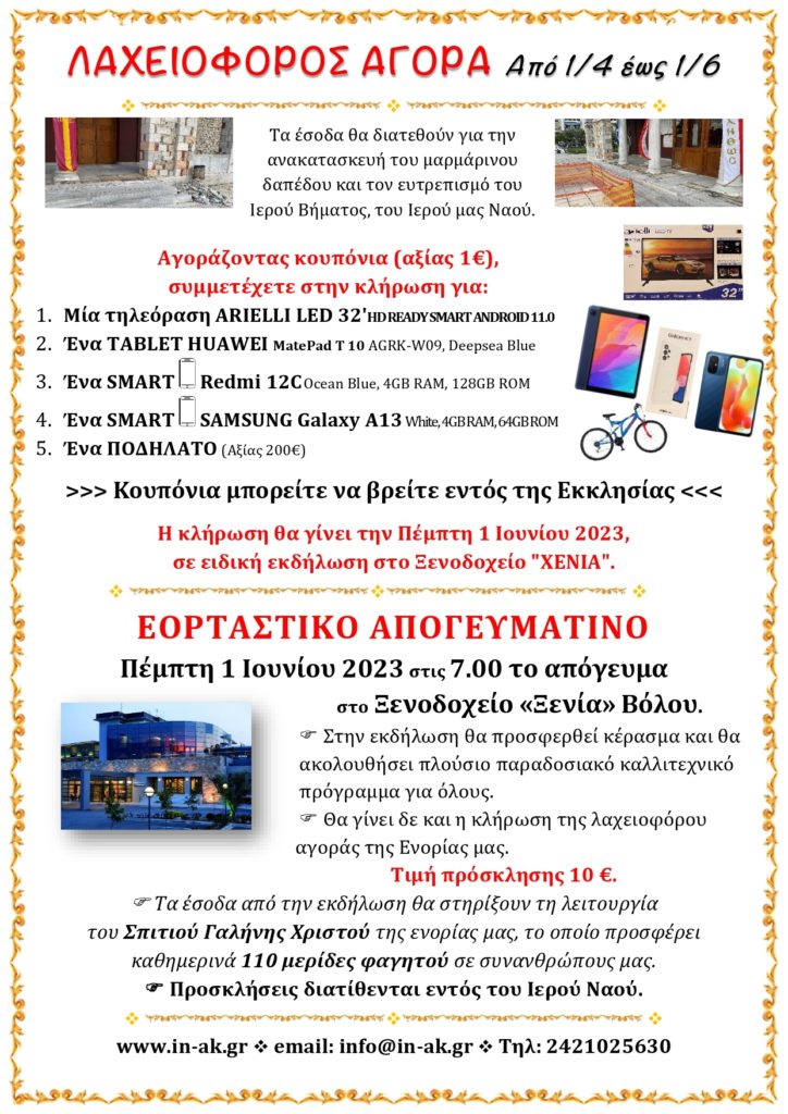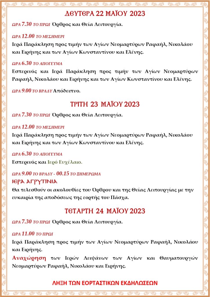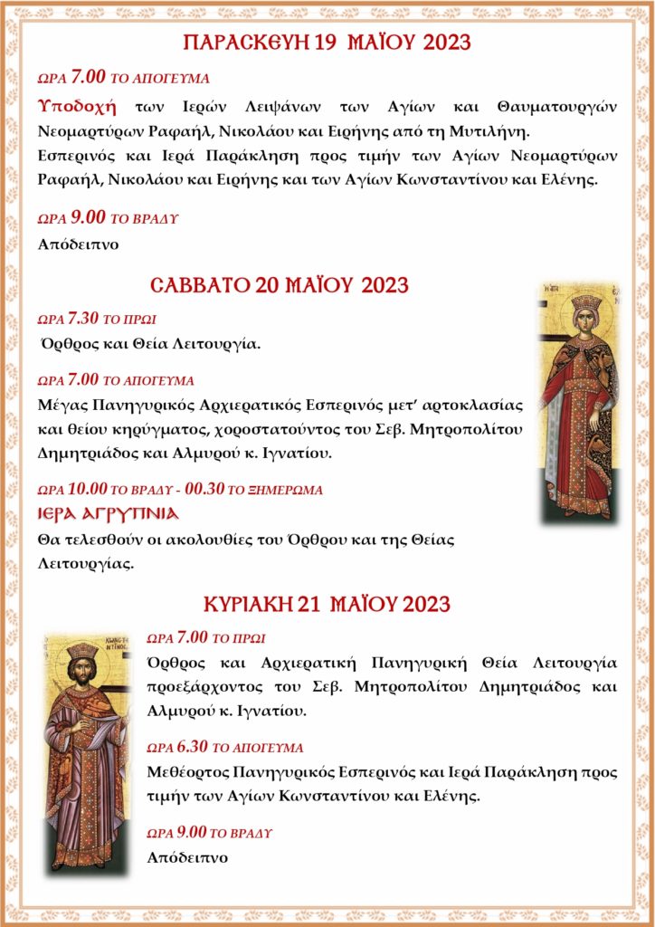 11/05/2023 13/05/2023 Τα Ιερά Λείψανα των Αγίων και Θαυματουργών Νεομαρτύρων Ραφαήλ, Νικολάου και Ειρήνης από τη Μυτιλήνη, τα οποία ευλαβείται ο χριστεπώνυμος λαός της πατρίδας, θα έχει την ευλογία να φιλοξενήσει ο Ιερός Ναός των Αγίων Κωνσταντίνου και Ελένης Βόλου, στα πλαίσια του Ετήσιου Εορτασμού των Αγίων, από τις 19 έως και τίς 24 Μαΐου. Η υποδοχή...