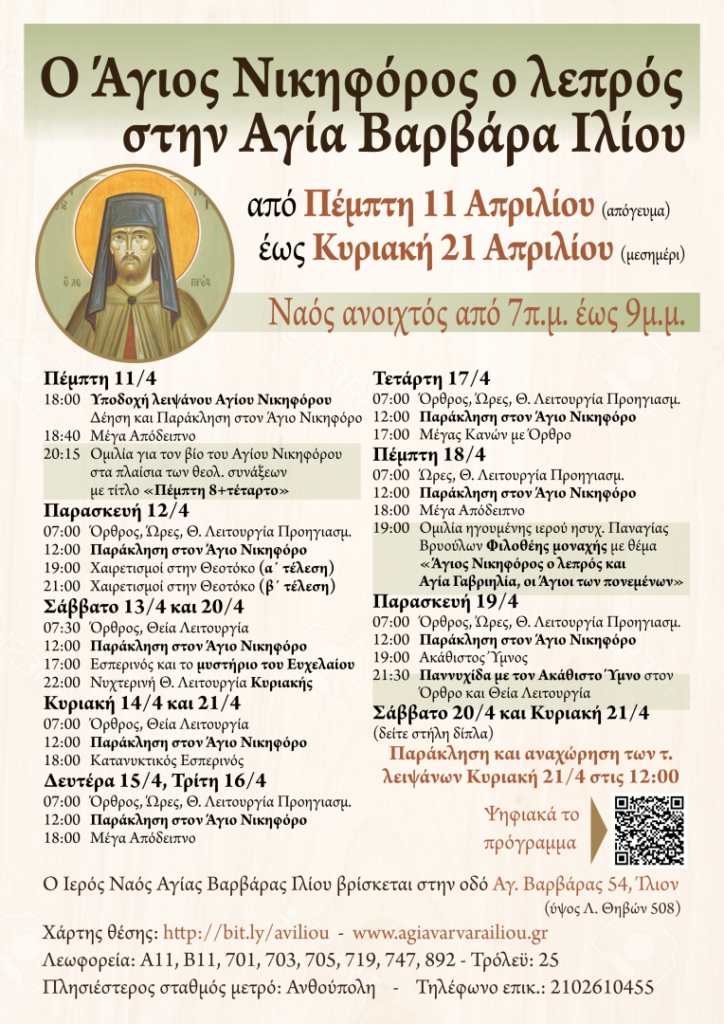 Η ενορία της Αγίας Βαρβάρας Ιλίου υποδέχεται τα τίμια λείψανα του νέου Αγίου Νικηφόρου του λεπρού από την Πέμπτη 11 Απριλίου έως την Κυριακή 21 Απριλίου 2024.