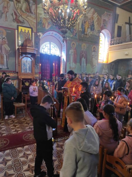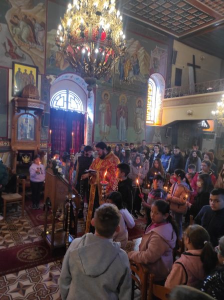 Μετά το πέρας της Ακολουθίας, ο εφημέριος του Ναού, π. Αμβρόσιος, μίλησε στους μαθητές εξηγώντας τη σημασία των Χαιρετισμών προς την Παναγία μας. Παράλληλα, εξέφρασε τις θερμές του ευχαριστίες προς τη διευθύντρια του Γυμνασίου, τον διευθυντή του Δημοτικού, τους καθηγητές, τους δασκάλους, καθώς και προς τις μαθήτριες και τους μαθητές για τη συμμετοχή τους στην Ιερά Ακολουθία.