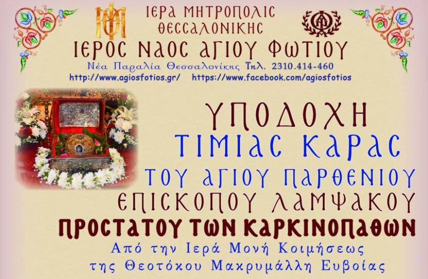Ξεκίνησε, από εχθές, Τετάρτη 2 Οκτωβρίου 2019, το εσπέρας, η προσκύνησις της Τιμίας Κάρας του Αγίου Παρθενίου Επισκόπου Λαμψάκου και Προστάτου των Καρκινοπαθών στον Ιερό Ναό Αγίου Φωτίου του Μεγάλου Θεσσαλονίκης. Η Τιμία Κάρα θα παραμείνει στον Ιερό Ναό έως τη Δευτέρα 7 Οκτωβρίου στις 6.00 μ.μ.