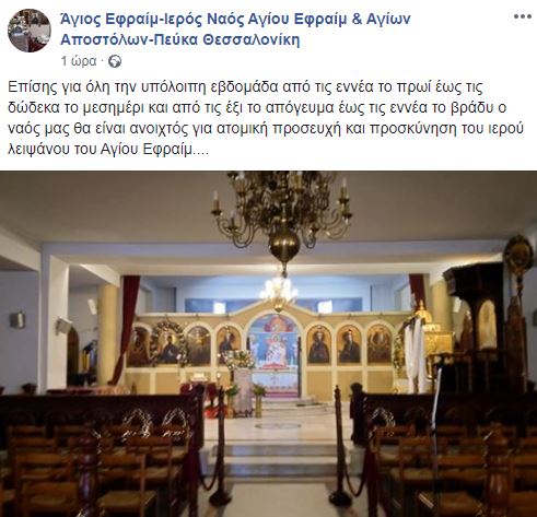 ΘΕΣΣΑΛΟΝΙΚΗ – Για όλη την υπόλοιπη εβδομάδα, από τις εννέα το πρωί έως τις δώδεκα το μεσημέρι και από τις έξι το απόγευμα έως τις εννέα το βράδυ, ο Ιερός Ναός Αγίου Εφραίμ & Αγίων Αποστόλων-Πεύκα Θεσσαλονίκης θα είναι ανοιχτός για ατομική προσευχή και προσκύνηση του ιερού λειψάνου του Αγίου Εφραίμ.