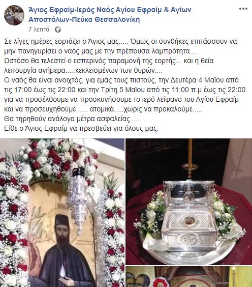 Ο ναός θα είναι ανοιχτός, για τους πιστούς, την Δευτέρα 4 Μαϊου από τις 17:00 έως τις 22:00 και την Τρίτη 5 Μαϊου από τις 11:00 π.μ έως τις 22:00 για να προσέλθουν να προσκυνήσουν το ιερό λείψανο του Αγίου Εφραίμ και να προσευχηθούν ατομικά, με τα ανάλογα μέτρα.
