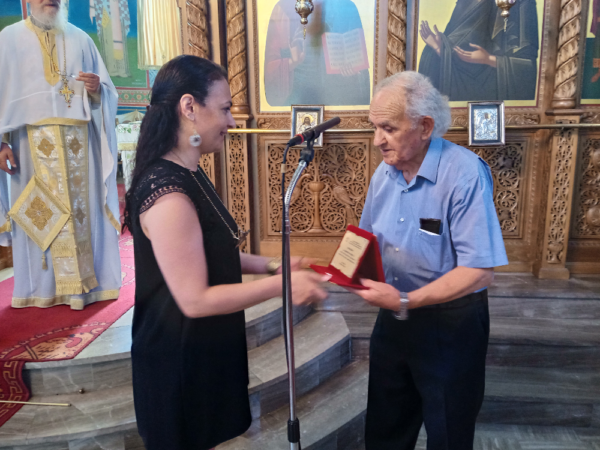 «Ο Θεός προίκισε με το τάλαντο της ιεροψαλτικής, τον αξιολογότατο αδελφό εν Χριστώ Δημήτριο από μικρό παιδί και ο φίλτατος Δημήτρης με περίσσια εργατικότητα, υπομονή, το ανέδειξε αυτό το τάλαντο σε επιστήμη και έγινε παράδειγμα προς μίμηση. Υπηρέτησε το ιερόν αναλόγιον της ενορίας μας επί 30 συναπτά έτη. Σήμερα αγαπητοί μου αδελφοί στο πρόσωπό του τιμούμε όλους τους Ιεροψάλτες, που κρατούν ζωντανή την ιερή παράδοσή μας. Παράλληλα μαζί με την εκπρόσωπο του Δημοτικού Σχολείου Διευθύντρια κυρία Ευφροσύνη Ζάχαρη τον τιμούμε επίσης και για την διαχρονική, πολύτιμη προσφορά του στο χώρο της πρωτοβάθμιας εκπαίδευσης. Η Ψαλτική τέχνη δεν είναι μια απλή διαδικασία, είναι η ζεύξη για την προσευχητική επικοινωνία όλων μας με τον Θεό», τόνισε ο π Λάμπρος απονέμοντας παράλληλα την τιμητική διάκριση της ενορίας.