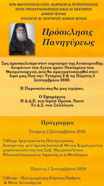 Ο Ιερός Προσκυνηματικός Ναός Αγίου Νεκταρίου Άνω Λιοσίων πανηγυρίζει την ανακομιδή των λειψάνων του Αγίου Νεκταρίου την Τετάρτη 2 και την Πέμπτη 3 Σεπτεμβρίου 2020. Μάλιστα, στον Πανηγυρικό Εσπερινό θα χοροστατήσει ο Σεβασμιώτατος Μητροπολίτης Ηλιουπόλεως κάτω Αφρικής κ. Θεόδωρος.