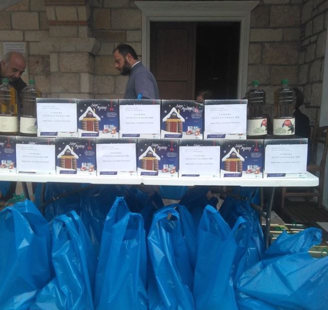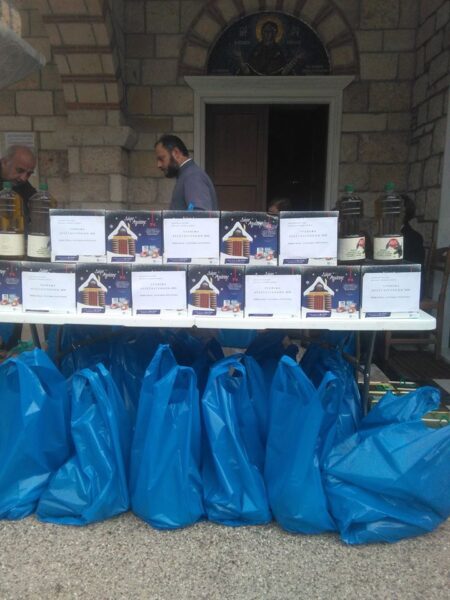Στο φωτογραφικό στιγμιότυπο, το Χριστουγεννιάτικο δέμα αγάπης 2019 από τον ιερό ναό Αγίας Παρασκευής Νέας Πεντέλης με: Λάδι, πατάτες, κρεμμύδια, πορτοκάλια, μανταρίνια, λάχανο, κρασί, γλυκά και πολλά άλλα.