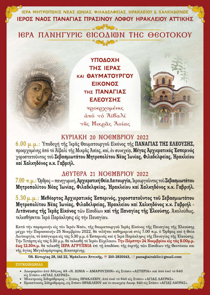 Με την ευκαιρία της μεγάλης Θεομητορικής εορτής των Εισοδίων της Υπεραγίας Θεοτόκου πανηγυρίζει το διήμερο 20 και 21 Νοεμβρίου 2022 ο Ιερός Ναός Υπεραγίας Θεοτόκου Πρασίνου Λόφου Ηρακλείου Αττικής.