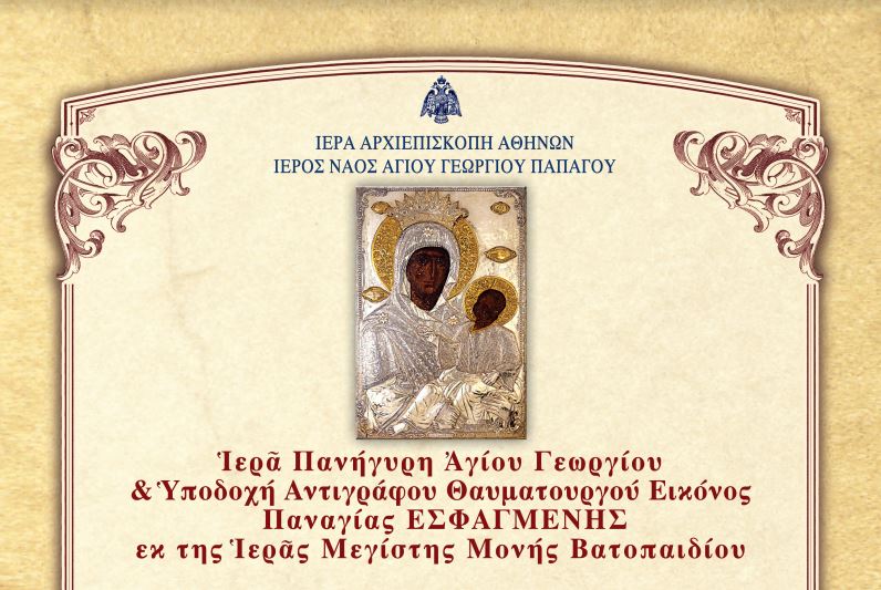 Πρόγραμμα Ιεράς Πανηγύρεως Αγίου Γεωργίου και Υποδοχής της Ιεράς και Θαυματουργού Εικόνος της Παναγίας της Εσφαγμένης εις τον Ιερόν Ναόν Αγίου Γεωργίου Παπάγου από την Ιερά Μεγίστη Μονή Βατοπαιδίου, κατά την Τρίτη 5 Νοεμβρίου 2019 και ώρα 18.00 της εσπέρας.