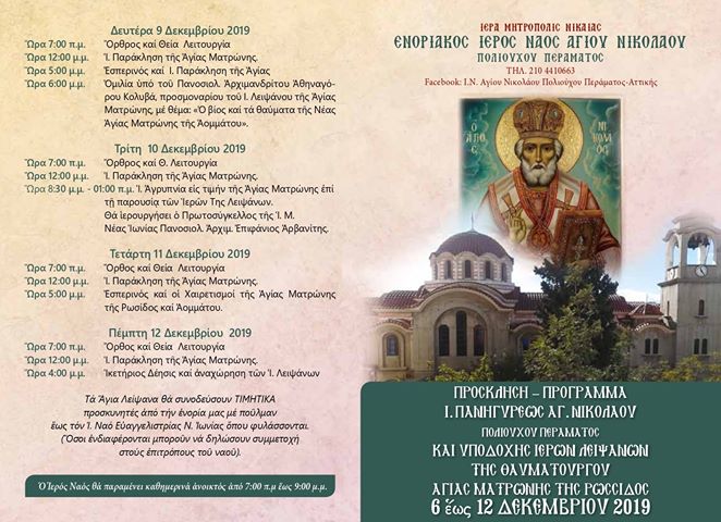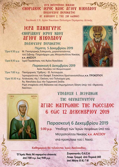 Πανηγυρίζει ο Ιερός Ναός του Αγίου Νικολάου, πολιούχου Περάματος και η πόλη αναμένεται να υποδεχθεί τα ιερά Λείψανα της Αγίας Ματρώνης της Ρωσίδος.