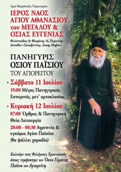 ΙΕΡΑ ΜΗΤΡΟΠΟΛΗ ΠΕΡΙΣΤΕΡΙΟΥ – Ο Ιερός Ναός Αγίου Αθανασίου του Μεγάλου και Οσίας Ευγενίας πανηγυρίζει τη μνήμη του Αγίου Παϊσίου του Αγιορείτου κατά το Σάββατο και Κυριακή 11-12 Ιουλίου 2020. Επισυνάπτεται η αφίσα της πανηγύρεως προς τιμήν του Αγίου.