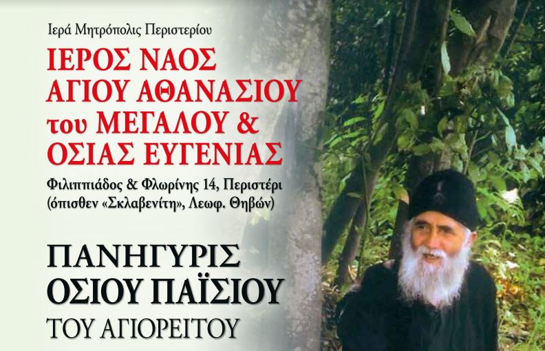 ΙΕΡΑ ΜΗΤΡΟΠΟΛΗ ΠΕΡΙΣΤΕΡΙΟΥ – Ο Ιερός Ναός Αγίου Αθανασίου του Μεγάλου και Οσίας Ευγενίας πανηγυρίζει τη μνήμη του Αγίου Παϊσίου του Αγιορείτου κατά το Σάββατο και Κυριακή 11-12 Ιουλίου 2020. Επισυνάπτεται η αφίσα της πανηγύρεως προς τιμήν του Αγίου.