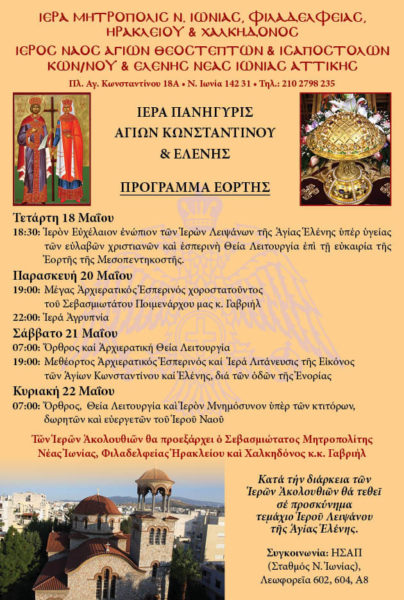 Το πρόγραμμα της πανηγύρεως του Ι.Ν. Αγίων Κωνσταντίνου και Ελένης Νέας Ιωνίας