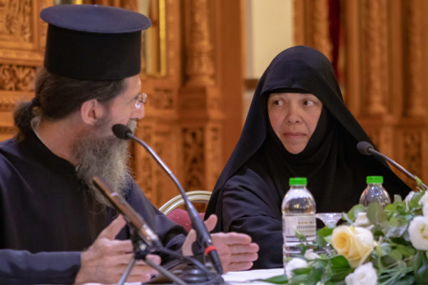 Η Γερόντισσα άρχισε με το ερώτημα, το οποίο ήταν και ο τίτλος της ομιλίας της: “Tο θέλημά Σου ή το θέλημά μου Κύριε; Αυτό όπως καταλαβαίνουμε όλοι μας δεν είναι μόνο βίωμα των μοναχών. Ναι μεν εμάς είναι στόχος μας καθημερινός σε ένα δύσκολο και αδυσώπητο πνευματικό αγώνα, γιατί έχουμε να κάνουμε συνέχεια με τον εαυτό μας. Αυτό όμως είναι και ένας δικό σας πόλεμος, που ζείτε μέσα στον κόσμο. Είναι ένας πόλεμος και ένας αγώνας που διεξάγουμε όλοι όσοι θέλουμε να είμαστε του Χριστού. Βλέπετε τι όμορφα ήταν στον παράδεισο ενωμένοι με τον Θεό μας ο Αδάμ και η Εύα. Κοινωνούσαν με τον Θεό αδιάλειπτα. Δεν μπορούμε να φανταστούμε την δόξα αυτής της κοινωνίας, την προσδοκούμε όμως και εμείς. Την θέλουμε, έτσι όπως ακριβώς μας μίλησε ο Χριστός όταν ήρθε και κήρυξε πάνω στη γη και είπε: «θέλω να είμαστε ένα». Μας έχει καλέσει λοιπόν όλους μας ο Κύριος να είμαστε ένα με Αυτόν. Από τότε που φύγαμε από τον παράδεισο, ζούμε αυτή τη διάσπαση, αυτή την διάρρηξη της σχέσης μας με τον Θεό. Αυτό είναι το μόνο πρόβλημά μας και αυτός είναι και ο μόνος στόχος της ζωής μας, να τα ξαναβρούμε με τον Θεό, να γυρίσουμε πίσω εκεί που ανήκουμε, σε Αυτόν”.