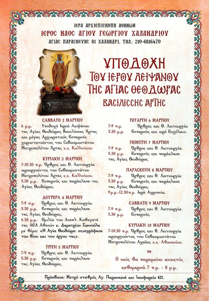 Κλήρος και λαός στην πόλη του Χαλανδρίου θα έχουν την ευλογία να υποδεχθούν το Ιερό Λείψανο της Πολιούχου και Προστάτιδας της Άρτας Αγίας Θεοδώρας το απόγευμα του Σαββάτου 2 Μαρτίου 2024, στις 6:00 μ.μ., στον προαύλιο χώρο του Ιερού Ναού Αγίου Γεωργίου.