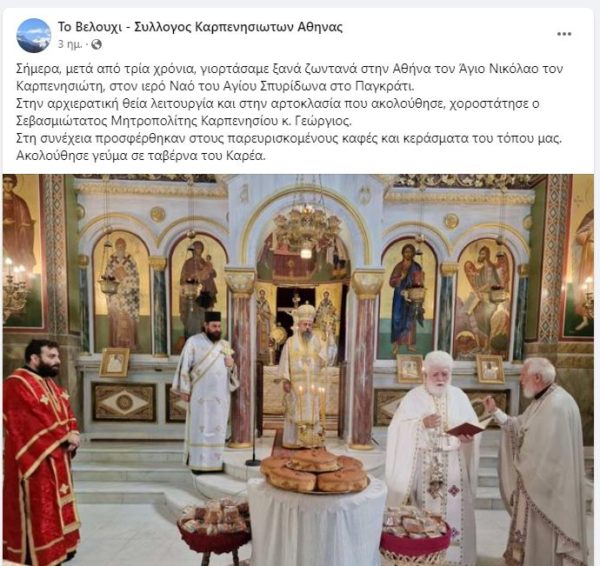 “Σήμερα, μετά από τρία χρόνια, γιορτάσαμε ξανά ζωντανά στην Αθήνα τον Άγιο Νικόλαο τον Καρπενησιώτη, στον ιερό Ναό του Αγίου Σπυρίδωνα στο Παγκράτι…” αναφέρει για τις εκδηλώσεις ο Σύλλογος Καρπενησιωτών Αθήνας “Το Βελούχι”.