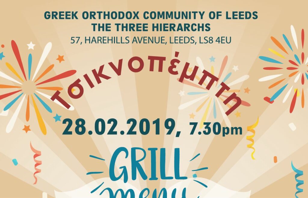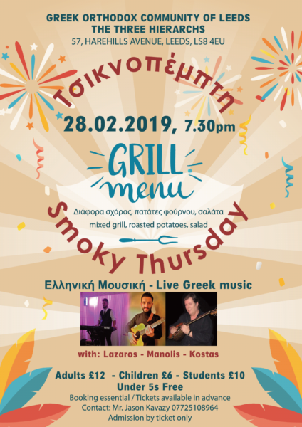 Η Ελληνορθόδοξη Κοινότητα Τριών Ιεραρχών Λίντς διοργανώνει μουσική βραδιά “Τσικνοπέμπτης” – “Smoky Thursday” – κατά τις 28 Φεβρουαρίου 2019 και ώρα 7.30 κατά την εσπέρα.