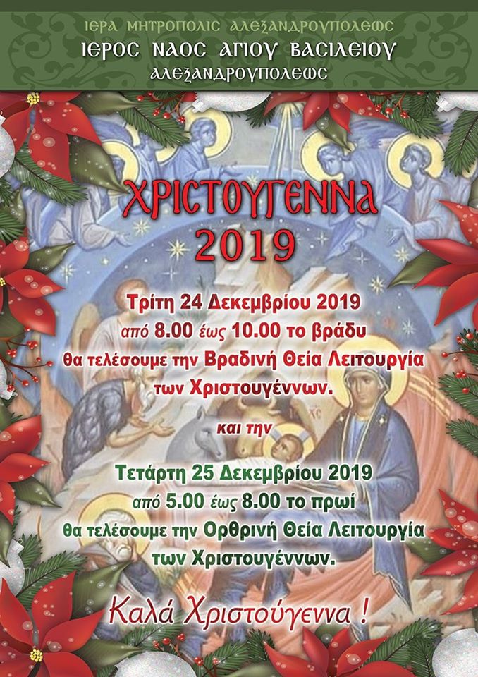 Ο Ιερός Ναός Αγίου Βασιλείου Αλεξανδρούπολης θα τελέσει βραδινή θεία λειτουργία στις 24 Δεκεμβρίου από τις 20:00 έως τις 22:30 το βράδυ για όσους δεν μπορούν να παρευρεθούν την ημέρα των Χριστουγέννων.