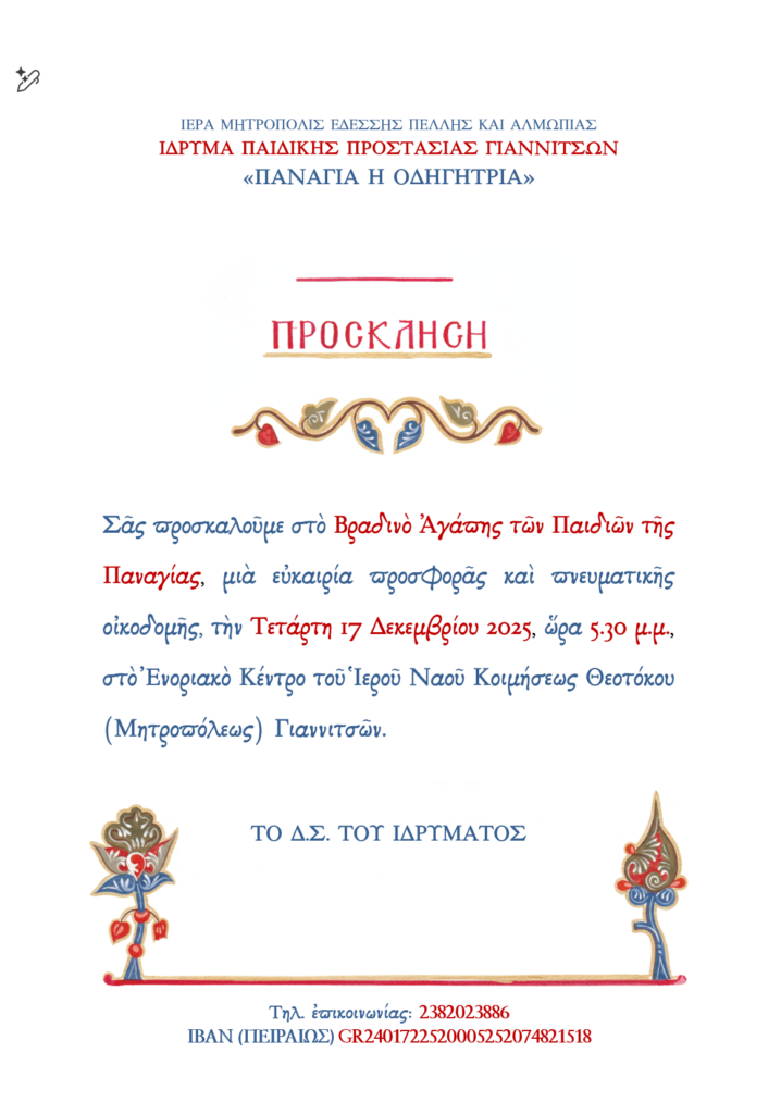 Βραδινό Αγάπης διοργανώνει το Ίδρυμα Παιδικής Προστασίας «Παναγία η Οδηγήτρια» της ενορίας Κοιμήσεως της Θεοτόκου (Μητροπόλεως) Γιαννιτσών την Τετάρτη 17 Δεκεμβρίου 2025, στις 5:30 μ.μ. στην Αίθουσα Εκδηλώσεων της ενορίας.