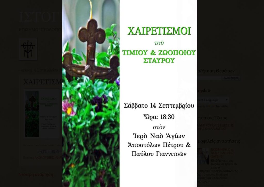 Το Σάββατο 14 Σεπτεμβρίου 2019, στις 6.30 μ.μ. μετά το πέρας του Εσπερινού στον Ιερό Ναό Αγίων Αποστόλων Πέτρου και Παύλου Γιαννιτσών, θα τελεσθεί η ακολουθία των Χαιρετισμών του Τιμίου και Ζωοποιού Σταυρού.