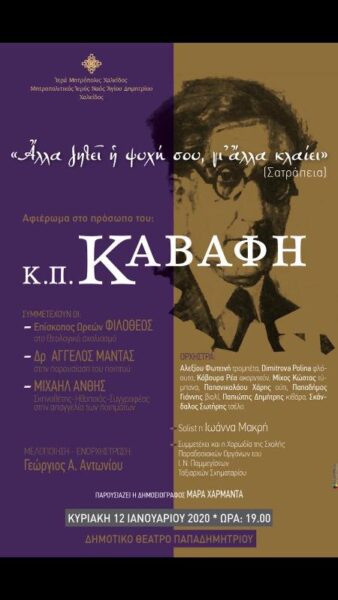 Ο Μητροπολιτικός Ι. Ν. Αγ. Δημητρίου Χαλκίδος διοργανώνει αφιερωματική εκδήλωση στον ποιητή Κωνσταντίνο Καβάφη την Κυριακή 12 Ιανουαρίου 2020, στο Δημοτικό Θέατρο Παπαδημητρίου, στις 7.00μ.μ.