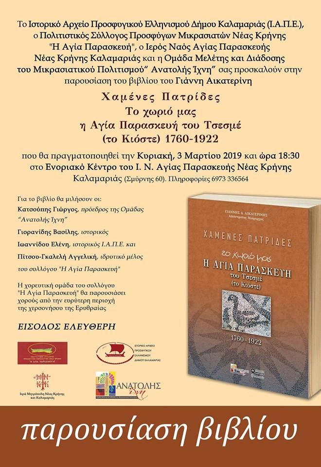 Παρουσίαση του βιβλίου του Γιάννη Αικατερίνη ‘’Χαμένες Πατρίδες – Το Χωριό μας, η Αγία Παρασκευή του Τσεσμέ’’ θα γίνει την Κυριακή 3 Μαρτίου 2019 στις 18:30 στο Ενοριακό Κέντρο του Ι.Ν. Αγίας Παρασκευής Νέας Κρήνης Καλαμαριάς (Σμύρνης 60).