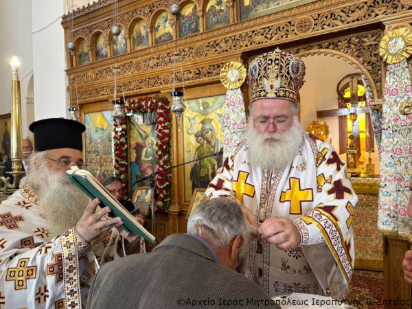 Στο τέλος της Αρχιερατικής Θείας Λειτουργίας ο Σεβ. Μητροπολίτης κ. Κύριλλος χειροθέτησε σε Αναγνώστη τον κ. Εμμανουήλ Στρατάκη, ο οποίος διακονεί στό αριστερό αναλόγιο του πανηγυρίζοντος ναού και Εκκλησιάρχη τον κ. Σπυρίδωνα Χριστινάκη, επί πολλά έτη διακονούντα ως νεωκόρο στο Ιερό Βήμα του ναού, και τους ευχήθηκε να έχουν υγεία ψυχής και σώματος για να συνεχίσουν με τον ίδιο ζήλο την αδιάλειπτη διακονία τους στην Ενορία Νέας Ανατολής.