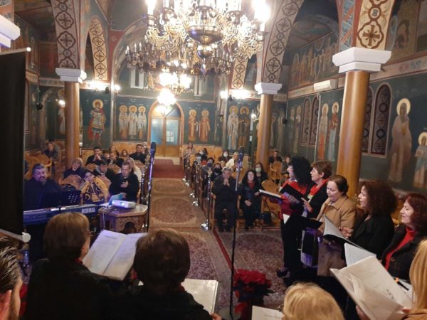 Τα κάλαντα απέδωσαν επιτυχώς το τμήμα της παραδοσιακής χορωδίας του Καλλιτεχνικού Ωδείου της ενορίας με την επίβλεψη και ποιμαντική μέριμνα του Πανοσ. Αρχιμανδρίτη Ρωμανού Μπασινά, εφημέριου του Ιερού Ναού και Διευθυντή του Καλλιτεχνικού Ωδείου, ο οποίος παρουσίασε το οδοιπορικό πρόγραμμα μέσα από την μουσική διαδρομή των παραδοσιακών καλάντων που απορρέουν από την παραδοσιακή αρμονία της χαρμοσύνου εορτής των Χριστουγέννων.
