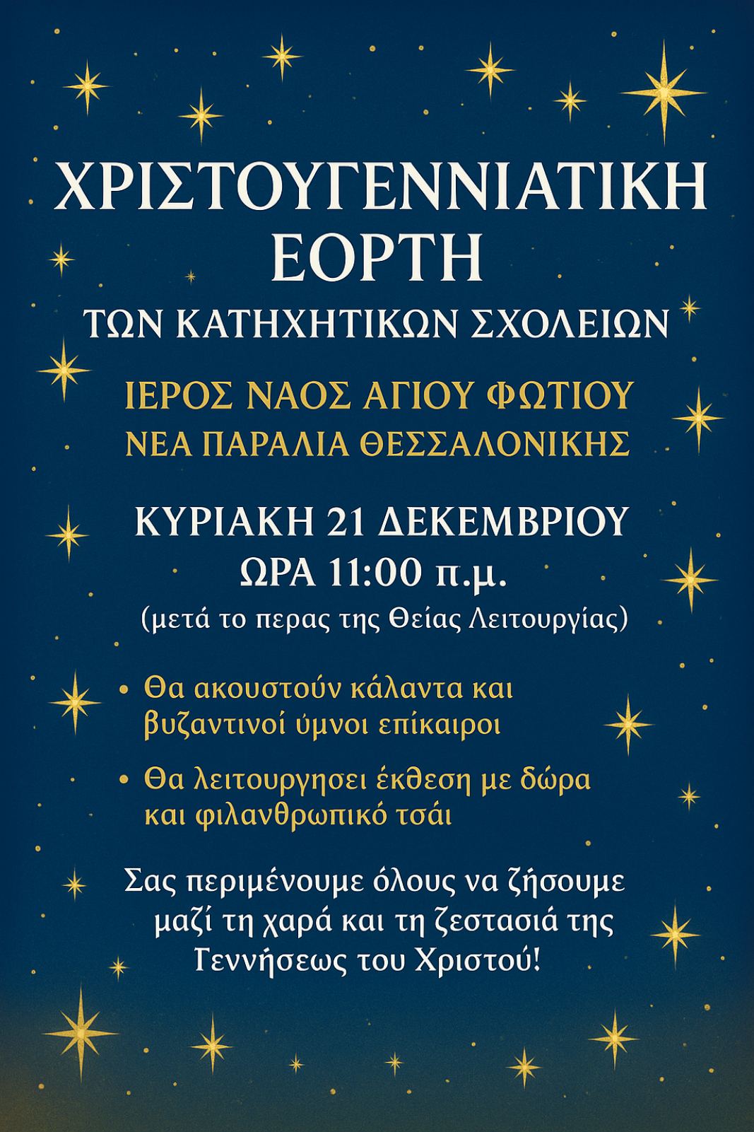 Ο Ιερός Ναός Αγίου Φωτίου Νέας Παραλίας Θεσσαλονίκης προσκαλεί στην Χριστουγεννιάτικη εορτή των Κατηχητικών Σχολείων, η οποία θα διεξαχθεί την Κυριακή 21 Δεκεμβρίου 2025, στις 11:00 π.μ., μετά το πέρας της Θείας Λειτουργίας.