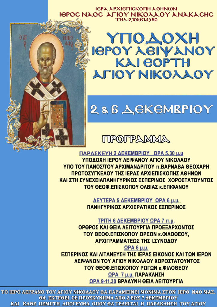 Ο Πρωτοσύγκελλος της Ιεράς Αρχιεπισκοπής Αθηνών θα υποδεχθεί το ιερό Λείψανο του Αγίου Νικολάου, στον ομώνυμο Ιερό Ναό Ανακάσης, την Παρασκευή 2 Δεκεμβρίου ώρα 5.30 μ.μ.. Θα ακολουθήσει Εσπερινός χοροστατούντος του Θεοφιλέστατου Επισκόπου Ολβίας κ. Επιφανίου.