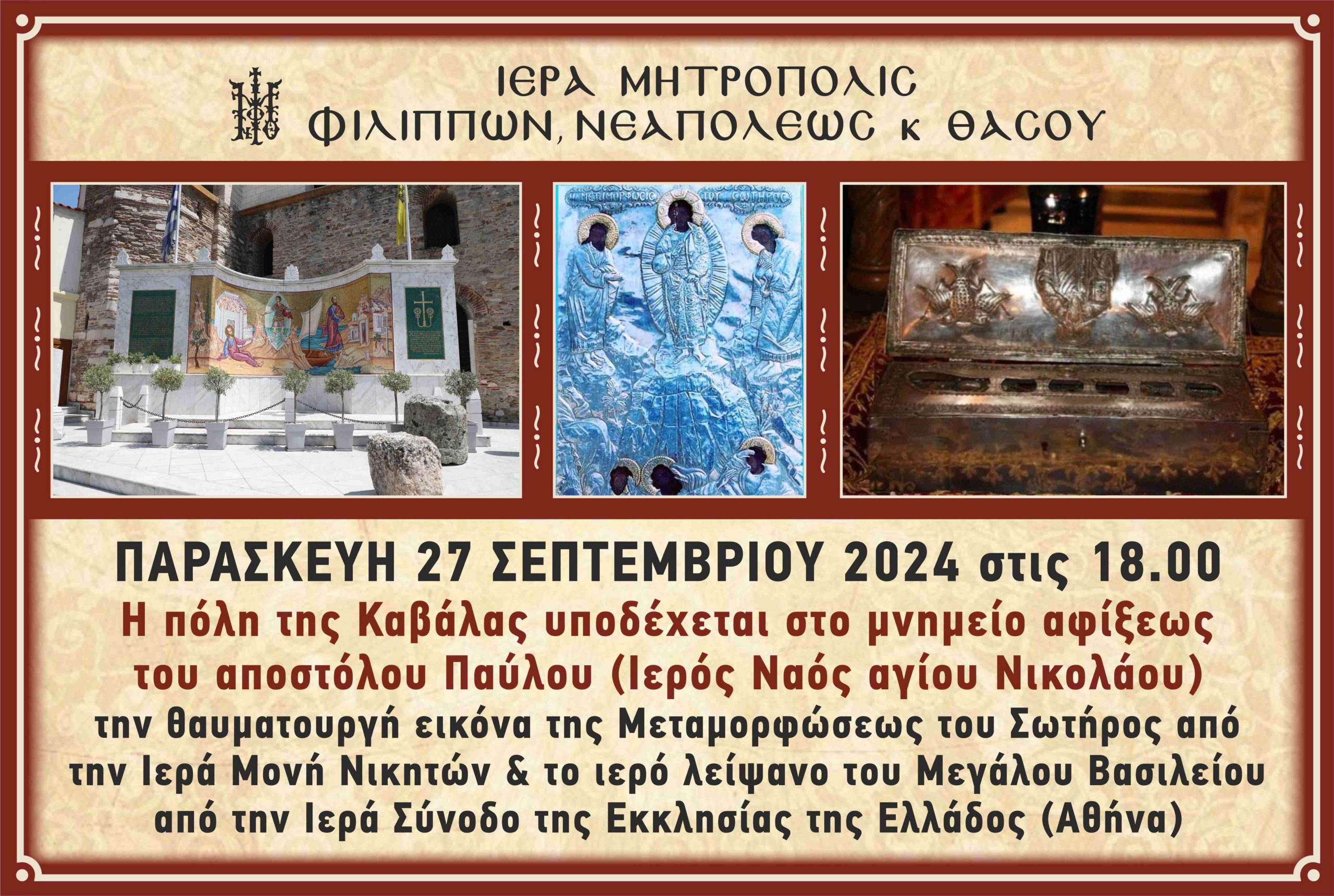 Την Παρασκευή 27 Σεπτεμβρίου 2024 στις 6 μ.μ. η πόλη της Καβάλας υποδέχεται στο μνημείο αφίξεως του αποστόλου Παύλου (Ιερός Ναός αγίου Νικολάου) την θαυματουργή εικόνα της Μεταμορφώσεως του Σωτήρος από την Ιερά Μονή Νικητών και τμήμα από το ιερό λείψανο του Μεγάλου Βασιλείου που φυλάσσεται στην Ιερά Σύνοδο της Εκκλησίας της Ελλάδος στην Αθήνα.