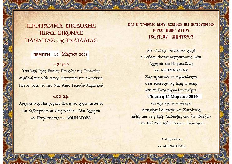 Την ιερά εικόνα της Παναγίας της Γαλιλαίας θα υποδεχθεί η ενορία του Αγίου Γεωργίου Καματερού, την Πέμπτη 14 Μαρτίου 2019, στις 17:30. Η εικόνα θα παραμείνει στον Ιερό Ναό του Αγίου Γεωργίου μέχρι τις 27 Μαρτίου 2019.