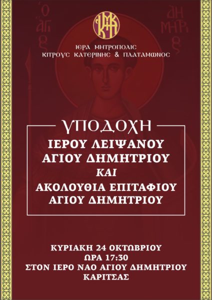 Την Κυριακή 24 Οκτωβρίου και ώρα 17:30 στον Ιερό Ναό Αγίου Δημητρίου Καρίτσας, θα πραγματοποιηθεί υποδοχή του ιερού Λειψάνου του Αγίου. Στη συνέχεια θα τελεσθεί η Ακολουθία του Επιταφίου του Αγίου Δημητρίου.