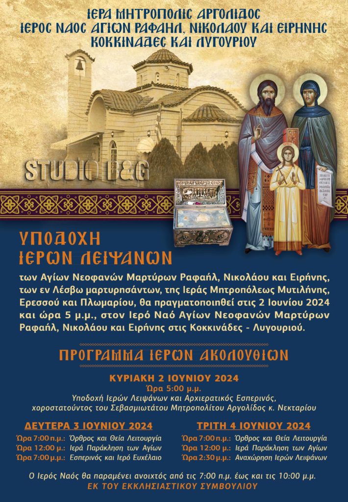 Υποδοχή Ιερών Λειψάνων των Αγίων Νεοφανών Μαρτύρων Ραφαήλ, Νικολάου και Ειρήνης, των εν Λέσβω μαρτυρησάντων, της Ιεράς Μητροπόλεως Μυτιλήνης, Ερεσσού και Πλωμαρίου,θα πραγματοποιηθεί στις 2 Ιουνίου 2024 στις 17:00, στον Ιερό Ναό Αγίων Νεοφανών Μαρτύρων Ραφαήλ, Νικολάου και Ειρήνης Κοκκινάδες – Λυγουριού στην Αργολίδα.