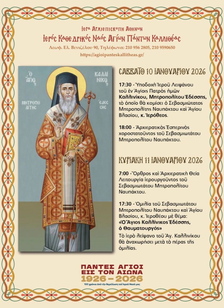 Η ενορία των Αγίων Πάντων Καλλιθέας υποδέχεται αύριο, Σάββατο, 10 Ιανουαρίου 2026, στις 17:30, το Ιερό Λείψανο του εν Αγίοις Πατρός ημών Καλλινίκου, Μητροπολίτου Εδέσσης, το οποίο θα κομίσει ο Σεβασμιώτατος Μητροπολίτης Ναυπάκτου και Αγίου Βλασίου κ. Ιερόθεος. Ακολούθως, θα τελεστεί αρχιερατικός εσπερινός.