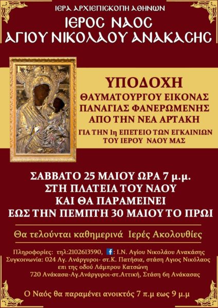 Την Θαυματουργό Ιερά Εικόνα της Παναγίας Φανερωμένης από τη Νέα Αρτάκη θα υποδεχθεί ο ενοριακός Ιερός Ναός Αγίου Νικολάου Ανακάσης Αττικής, με αφορμή την 1η Επέτειο των Εγκαινίων του Ιερού Ναού.