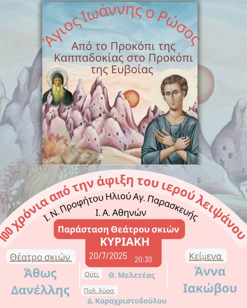 Ακόμη την Κυριακή 20 Ιουλίου στις 20:30 θα γίνει Μουσικοχορευτική Εκδήλωση και Παράσταση Θεάτρου Σκιών «Άγιος Ιωάννης ο Ρώσος, Από το Προκόπι της Καππαδοκίας στο Προκόπι Ευβοίας», στον προαύλιο χώρο του Ενοριακού Κέντρου Διακονίας.