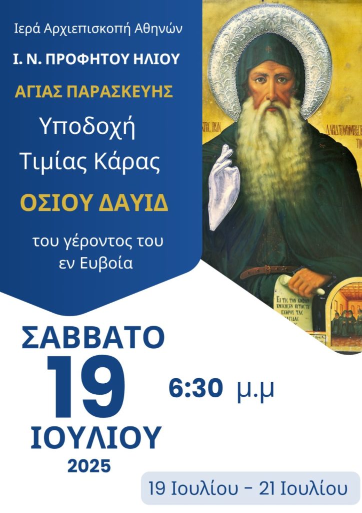 Στο πλαίσιο της Πανηγύρεως του Ιερού Ναού Προφήτου Ηλιού Δήμου Αγίας Παρασκευής Αττικής, το Σάββατο 19 Ιουλίου στις 18:30 θα γίνει επίσημη Υποδοχή της Τιμίας Κάρας του Οσίου Δαυίδ του Γέροντος του εν Ευβοία, η οποία θα παραμείνει στον Ιερό Ναό έως τη Δευτέρα