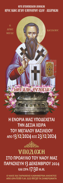 Με την ευλογία του Μακαριωτάτου Αρχιεπισκόπου Αθηνών και πάσης Ελλάδος κ. Ιερωνύμου, η Ενορία Αγίου Ελευθερίου οδού Αχαρνών υποδέχεται την Παρασκευή 13 Δεκεμβρίου 2024 και ώρα 17:30, στο προαύλιο του Ναού, την δεξιά χείρα του Μεγάλου Βασιλείου.