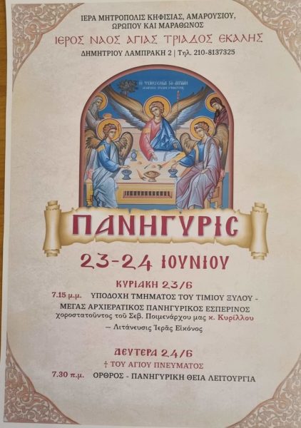 20/06/2024 20/06/2024 Ο Ιερός Ναός Αγίας Τριάδος Εκάλης θα υποδεχθεί τμήμα του Τιμίου Ξύλου την Κυριακή 23 Ιουνίου, στις 19:15. Θα τελεσθεί Μέγας Αρχιερατικός πανηγυρικός Εσπερινός χοροστατούντος του Σεβασμιωτάτου Μητροπολίτη Κηφισίας, Αμαρουσίου, Ωροπού και Μαραθώνος κ. Κυρίλλου. Στη συνέχεια θα γίνει λιτάνευση Ιεράς Εικόνας. Τη Δευτέρα του Αγίου Πνεύματος θα τελεσθεί Όρθρος και πανηγυρική Θεία Λειτουργία στις...