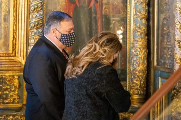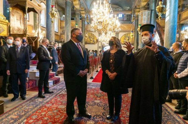 Μάλιστα, ο κ. Πομπέο και η σύζυγός του έκαναν και ολιγόλεπτη στάση τους μπροστά στην στήλη της Φραγγελώσεως, επί της οποίας ο Χριστός μαστιγώθηκε, και η οποία αποτελεί το αρχαιότερο ιερό κειμήλιο του Ναού, που μεταφέρθηκε στην Κων/πολη από την Αγία Ελένη μετά από επίσκεψή της εις τους Αγίους Τόπους.