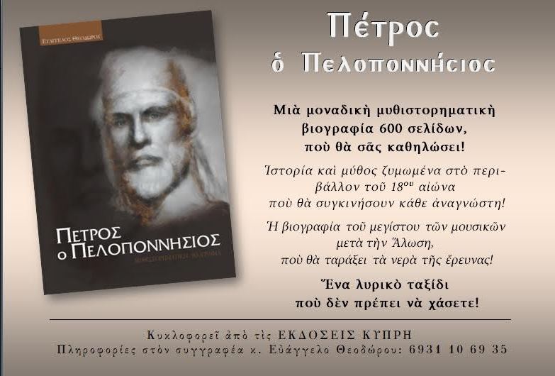 Με τίτλο “Πέτρος ο Πελοποννήσιος” κυκλοφόρησε μία μοναδική μυθιστορηματική βιογραφία 600 σελίδων. Πρόκειται για ιστορία που εκτυλίσσεται τον 18ο αιώνα.