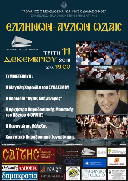Συμφωνία Εκκλησιαστικής και Παραδοσιακής Μουσικής της Μεγάλης Χορωδίας του Συνδέσμου Ιεροψαλτών, θα λάβει χώρα κατά την Τρίτη 11 Δεκεμβρίου 2018 και ώρα 19.00 κατά την εσπέρα στη Μεγάλη Αίθουσα του Πολεμικού Μουσείου Αθηνών.