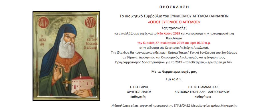 Το διοικητικό συμβούλιο του Συνδέσμου Αιτωλοακαρνάνων “Όσιος Ευγένιος ο Αιτωλός” προσκαλεί στην κοπή της πρωτοχρονιάτικης βασιλόπιτας την Κυριακή 27 Ιανουαρίου 2019 και ώρα 10.30 π.μ. στην αίθουσα της Χριστιανικής Στέγης Αιτωλικού
