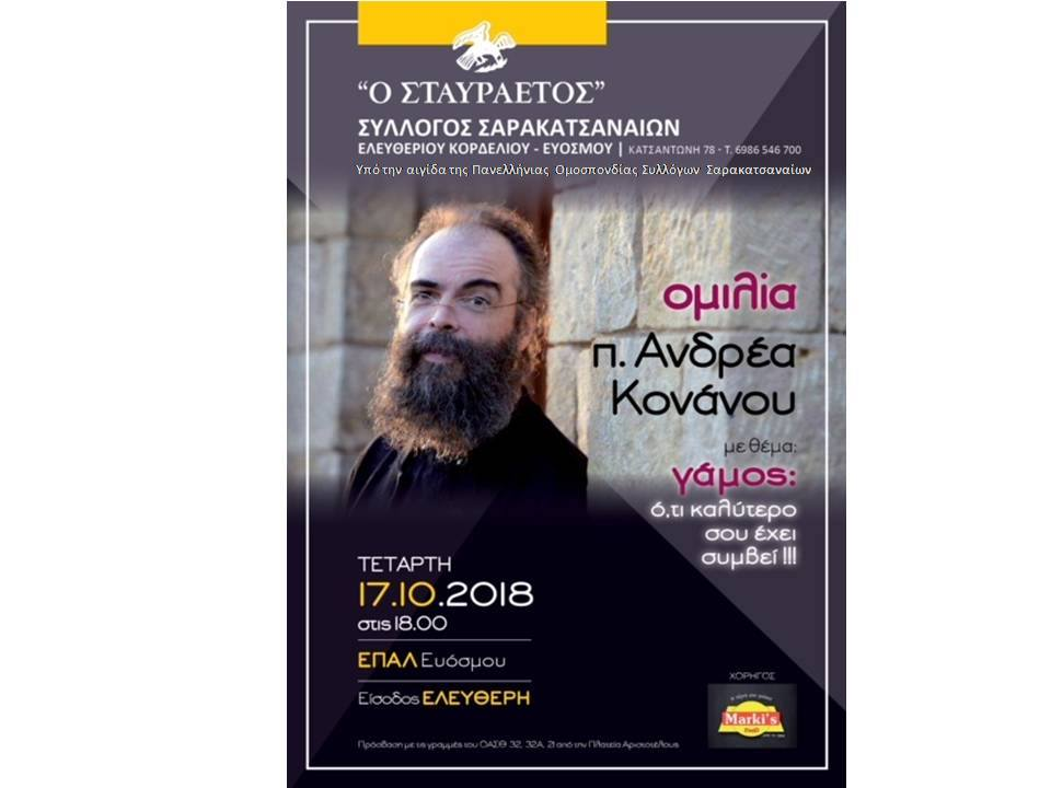 Ομιλία με θέμα “Γάμος ότι καλύτερο σου έχει συμβεί” αναμένεται να πραγματοποιήσει ο πανοσιολογιώτατος αρχιμανδρίτης Π.Ανδρέας Κονάνος την Τετάρτη 17/10/2018 στις 18:00 μ.μ στο ΕΠΑΛ Ευόσμου Θεσσαλονίκης.Την ομιλία διοργανώνει ο σύλλογος Σαρακατσαναίων “Ο ΣΤΑΥΡΑΕΤΟΣ”.