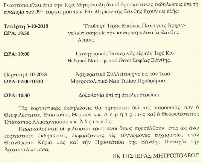 Τα 99 χρόνια από την απελευθέρωσης της Ξάνθης τιμά η Ιερά Μητρόπολη Ξάνθης και Περιθεωρίου με θρησκευτικές εκδηλώσεις την Τετάρτη 3-10-2018 και την Πέμπτη 4-10-2018.